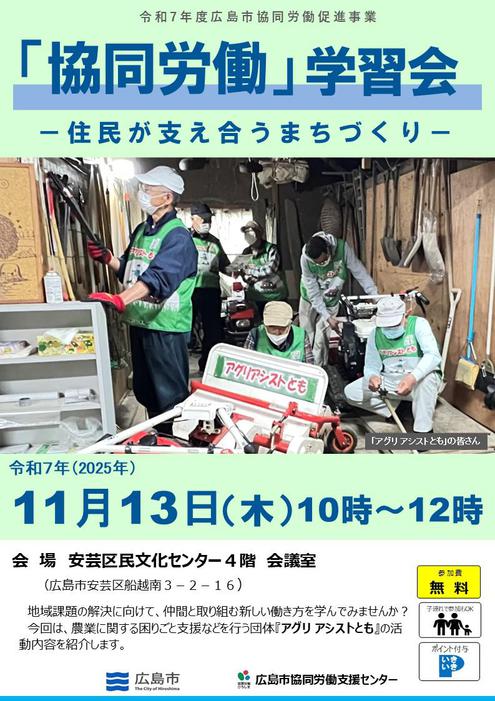 「協同労働」学習会を、11月13日(木)10時から安芸区民文化センターで開催します。