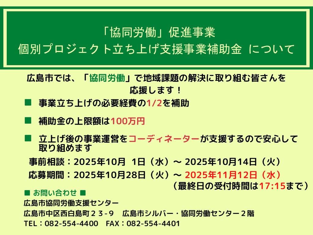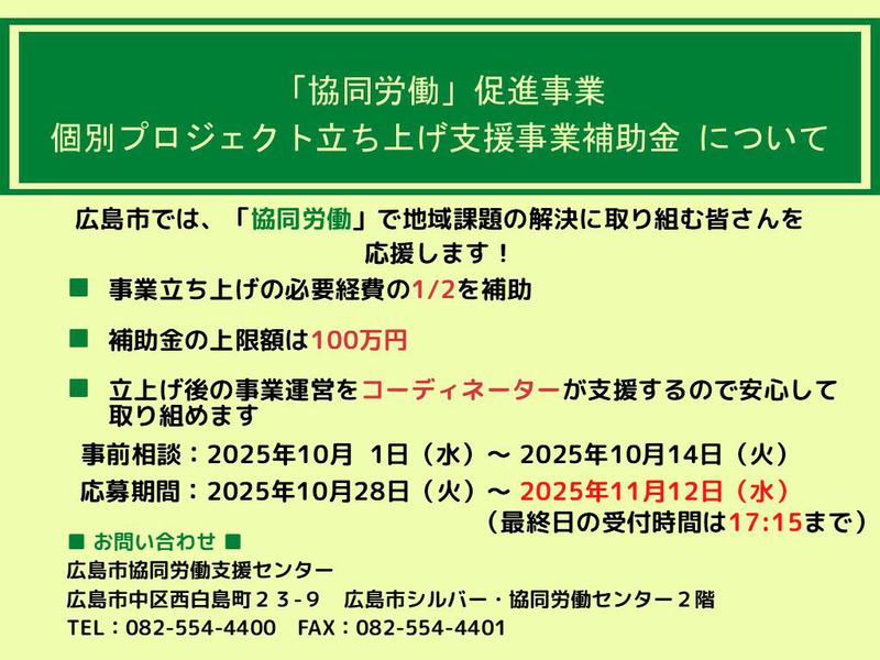 広島市は、就労や社会参加を希望する者が、「協同労働」を活用して広島市の地域課題の解決に取り組むことを促進し、持続可能で活力ある地域社会の実現を図ることを目的として、「協同労働」促進事業を実施しています。その一環として、「協同労働」の仕組みを活用した事業の立ち上げに必要な経費に対し、補助金を交付します。(補助率対象経費の総額の2分の1、上限合計100万円)