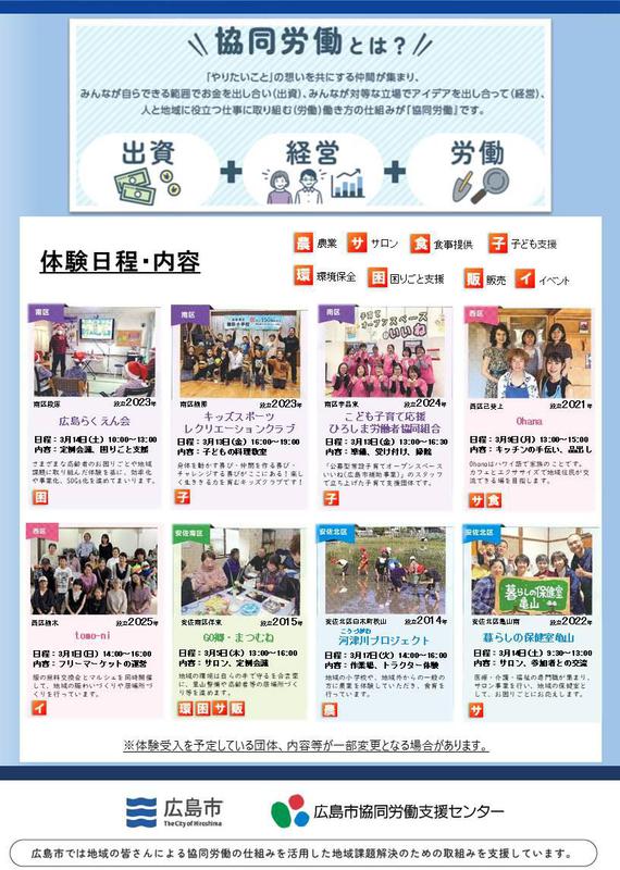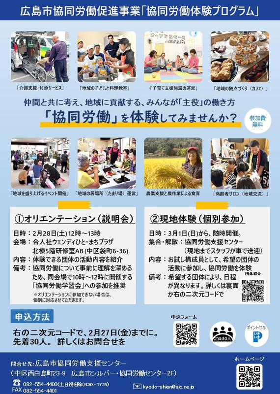 このたび広島市協同労働支援センターでは、協同労働団体のお試し構成員として、「協同労働」を